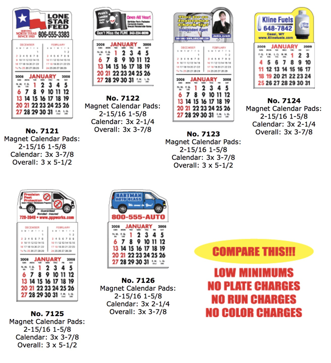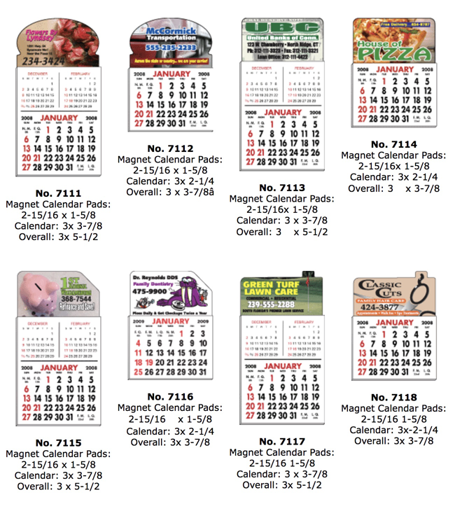 Magnetic Calendar Pads are four-color process digitally printed on white flexible magnets approximately .019 mil thick. The print method allows for reproduction of photographs and multi-colored logos with ease. These are great hand-outs for banks, real estate agents, the automotive industry, medical practices, churches, funeral homes, insurance companies and more. All colors will be created from 4-color process.