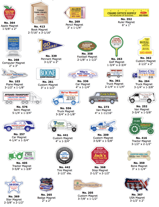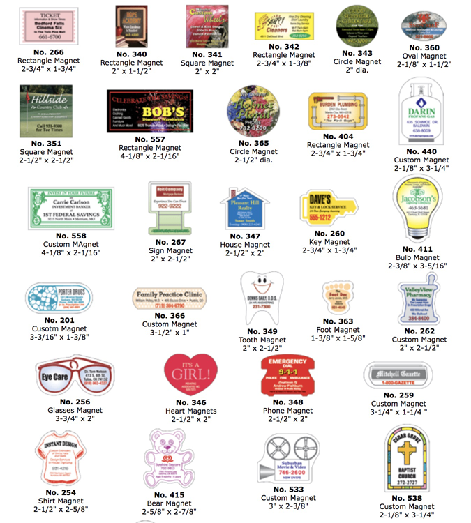 Our refrigerator mini magnets come in a variety of stock shapes shown below, or we can create a custom fridge magnet in your own shape and size. Custom refrigerator magnets are digitally printed in full color on a white magnetic material with a lamination. Magnet thickness is 19mil (thicker options available) and are suitable for indoor use only (if you need information on a custom outdoor magnet please contact us for a quote).